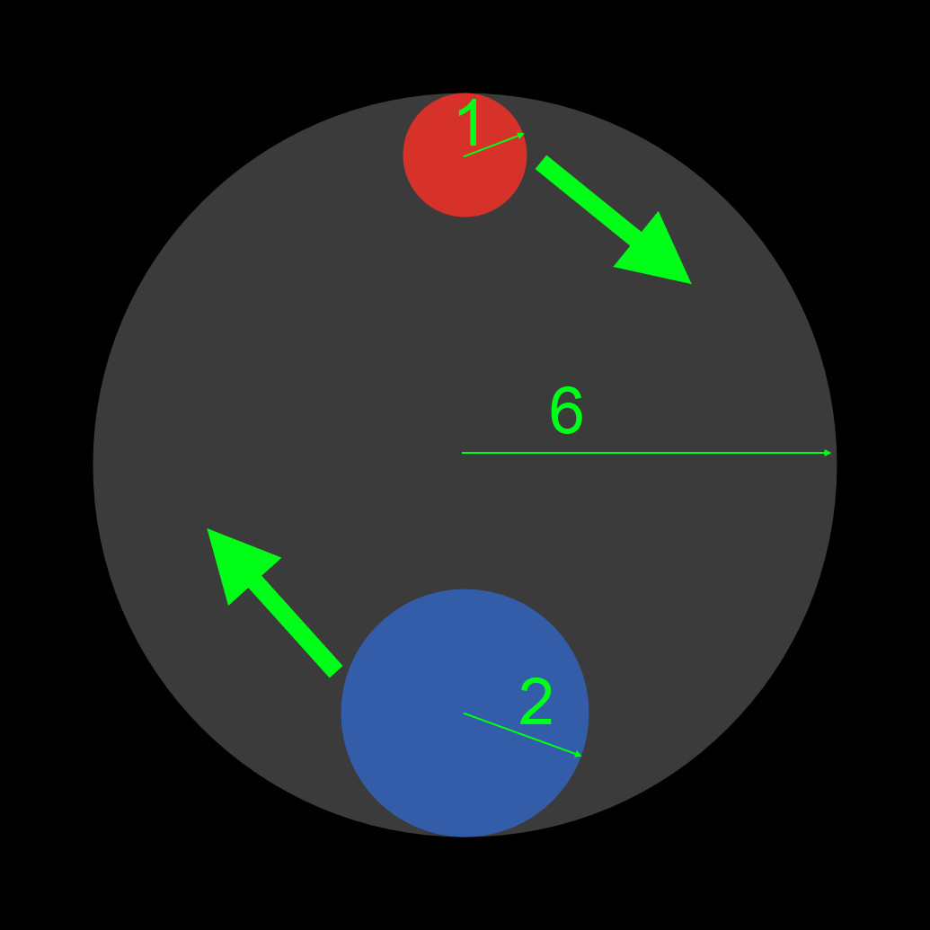 2014 Problem: A hollow cylinder with a 6 meter radius contains two cylinders, which are each in contact with the walls of the outer cylinder. These cylinders have radii of one meter and two meters, respectively. Both cylinders rotate with the same angular velocity and remain in contact with the walls of the hollow cylinder without slipping. If at time zero both cylinders are on opposite ends of the diameter of the large cylinder and are both heading clockwise around the outer cylinder, how far in meters will the center of the small cylinder travel before the large cylinder collides with it? Express your answer with at least 4 significant digits. |