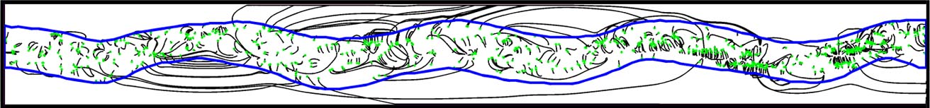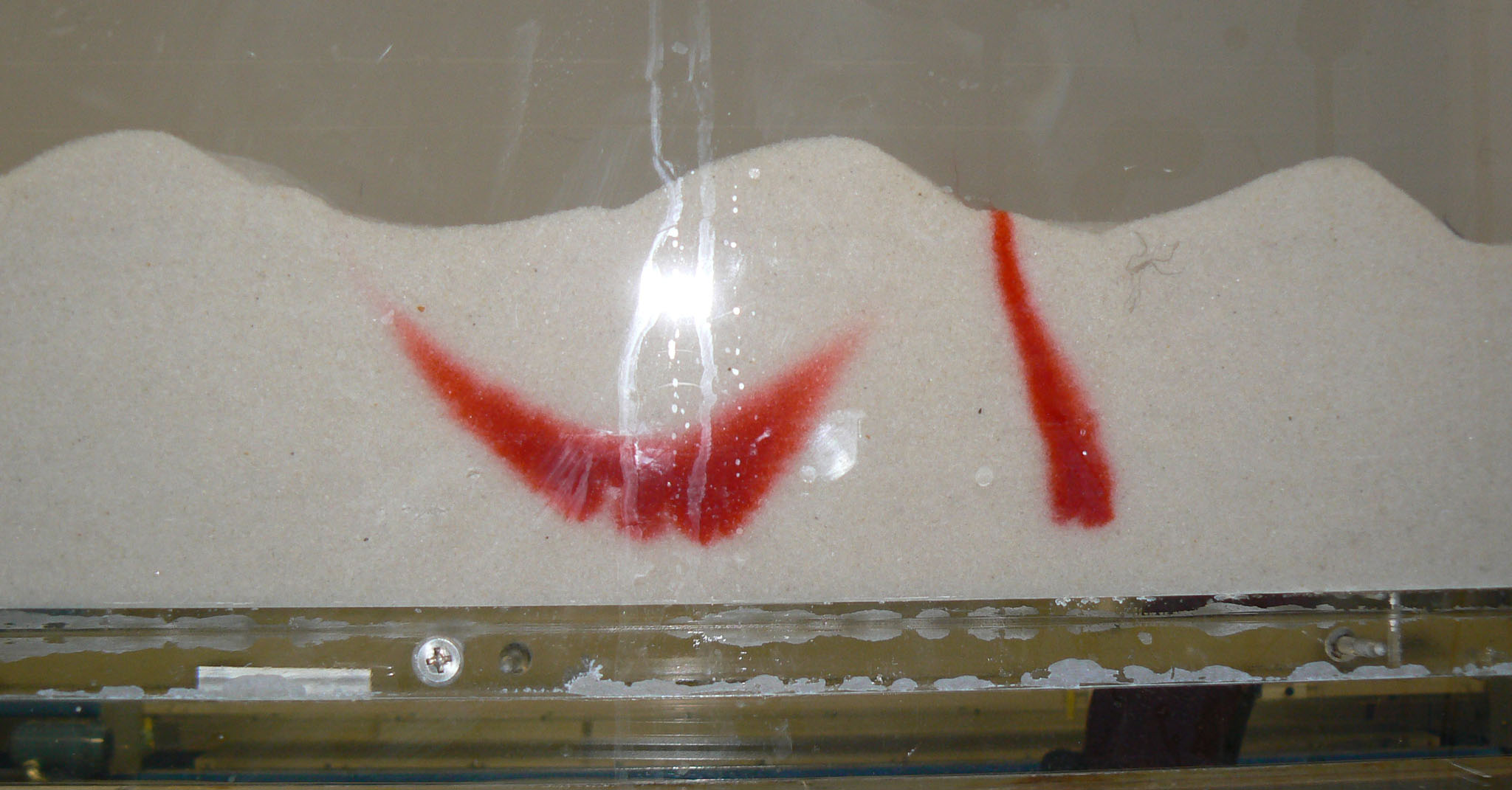 | Having spatially explicit information allowed me to evaluate the contributions of both gravitational- and current-driven hyporheic flow through various classes of stream channel features including ripples, dunes, and meanders. The model simulations indicate that all scales of topography between ripples and meanders have a significant effect on porewater flow fields and residence time distributions, but shallow exchange induced by current-driven interactions with small bedforms dominate the interfacial flux. Furthermore, complex interactions across the spectrum of topographic features play an important role in controlling the net interfacial flux and spatial distribution of hyporheic exchange. The key result from this work was demonstrating that simplified representations of the stream topography fall significantly short of representing the patterns and rates associated with hyporheic exchange. WRR 2010 Paper |