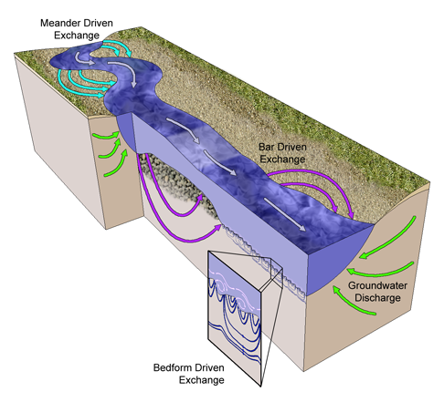 - Contribution of Scales of Topography to Hyporheic Exchange The objective of this effort was to compare subsurface flow induced at scales ranging from very small-scale bedforms up to much larger planform geomorphic features such as meanders. The model was applied to two distinct flume datasets: one with primarily 2D features and one with a 3D grid of bathymetry data.
