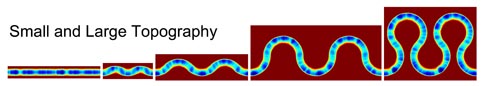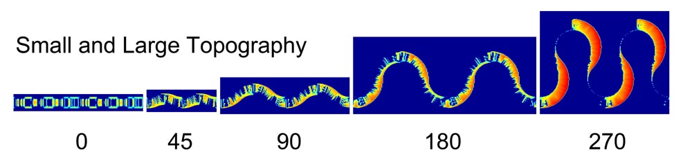 - EVOLVING TOPOGRAPHIES USING GENETIC ALGORITHMS In collaboration with Forrest Stonedahl we evolved topographies with a specific residence time distribution (RTD) using genetic algorithms. The genes of the genetic algorithm were the amplitudes and phase shifts corresponding to Fourier series that make up the topographies. We evaluated the topography's fitness by looking at how closely its generated RTD matched the goal RTD. The fitness value was then used to rank the topographies and they were then probabilistically selected by their fitness values to combine with other topographies, be copied into the next generation, or be mutated slightly. This eventually evolved topographies with very good RTDs.